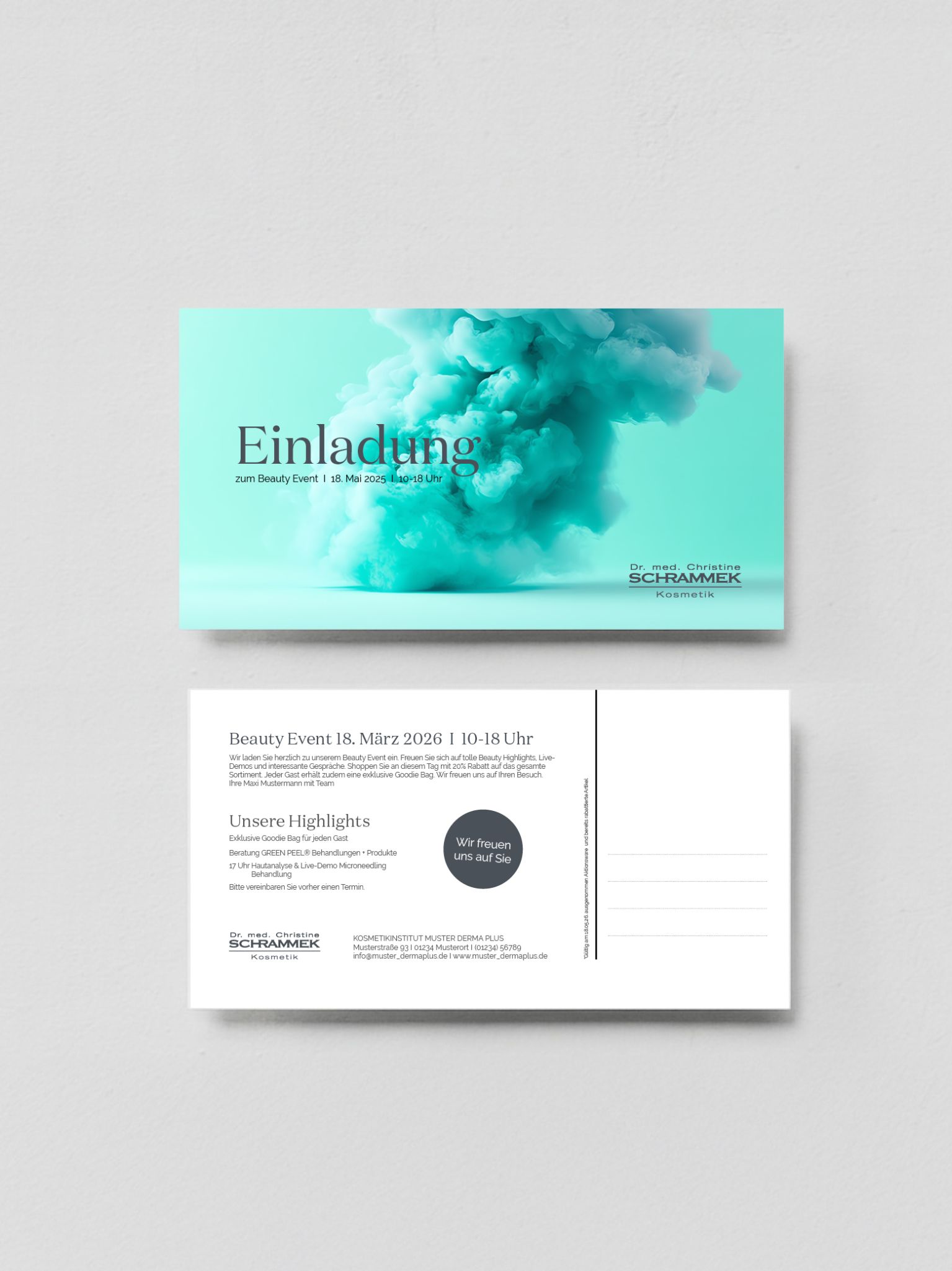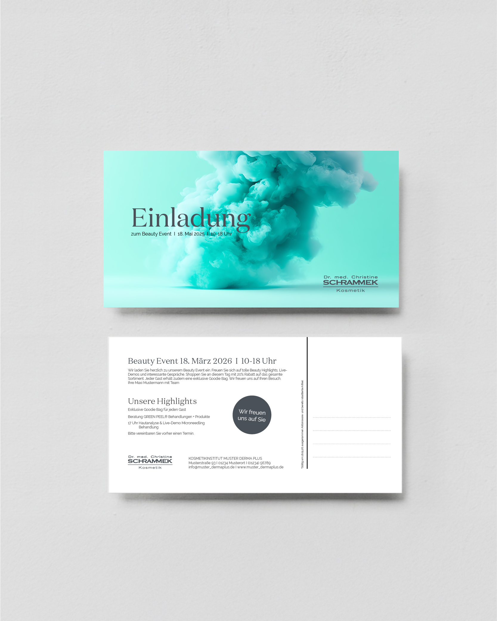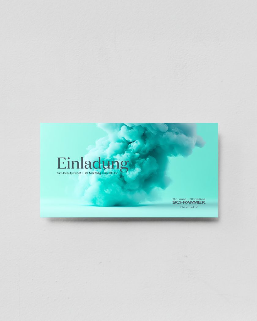 Mit einer hochwertigen Einladungskarte im DIN-Lang-Format lädst Du stilvoll zu besonderen Events in Deinem Kosmetikinstitut ein. Die Karten werden mit Deinen Institutsdaten personalisiert und bieten auf Vorder- und Rückseite genügend Platz, um alle wichtigen Informationen elegant zu präsentieren. So machst Du schon bei der Einladung einen professionellen und einladenden Eindruck